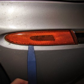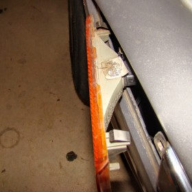 In order to get access to the bulb I took a trim removal tool and pried the side marker from the bottom until it popped out and then pulled out from the bottom and away at the top where the connecting prongs are. The pictures here should give a good idea of how it is held in place. You can also see that someone before has tried to pry ours from the top and cracked some pieces off of the marker lens.