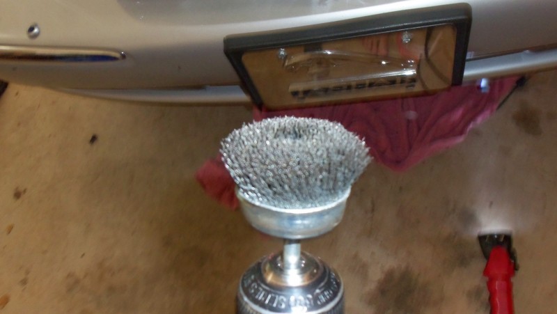 With the front of the car up on ramps I was able to get a good look at most of the rust I needed to take care of. With some safety goggles and good lighting I used my drill with a wire brush attachment to go over all of the rusted areas that I could get to. I used a small wire brush to get to the areas that I couldn’t reach with the drill.